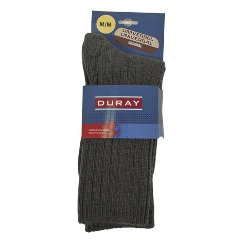 Duray , Women's original universal wool socks, size 9-11, are thin enough for everyday wear in your shoes, yet thick enough for your boots. It is made of 50% merino and lambs wool, 28% stretch nylon, 20% polypropylene (for wicking away moisture) and 2% spandex. This sock is superwash treated which is a chemical process applied to the socks after the initial wash at the plant to prevent shrinkage despite numerous washing and drying. This product is also available in other colors. Made in Canada.
